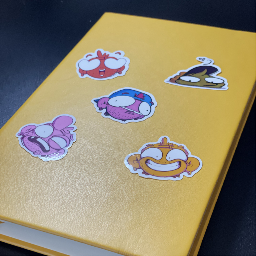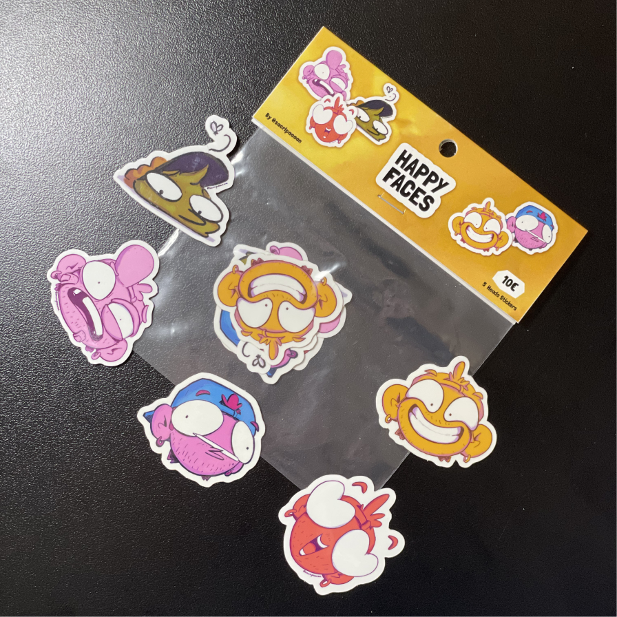 Pack Stickers – Happy Faces désigné et dessiné par l’artiste Sacripan. Le pack regroupe 5 autocollants, tous différents, uniques.