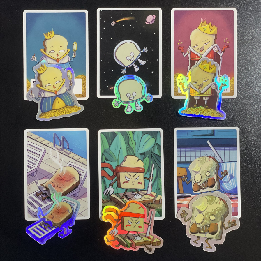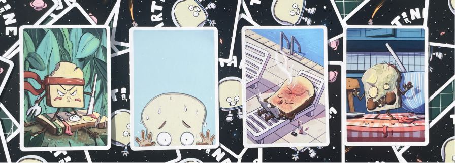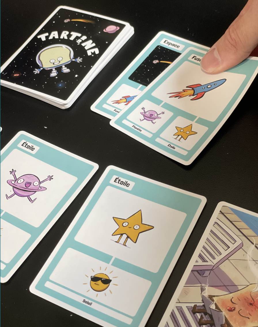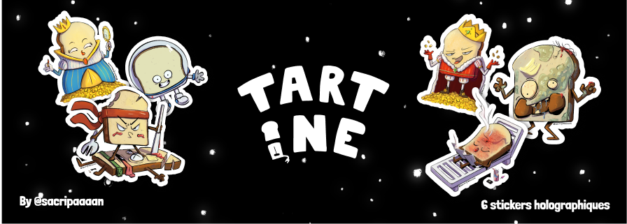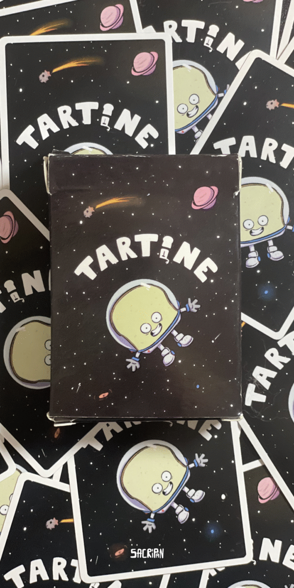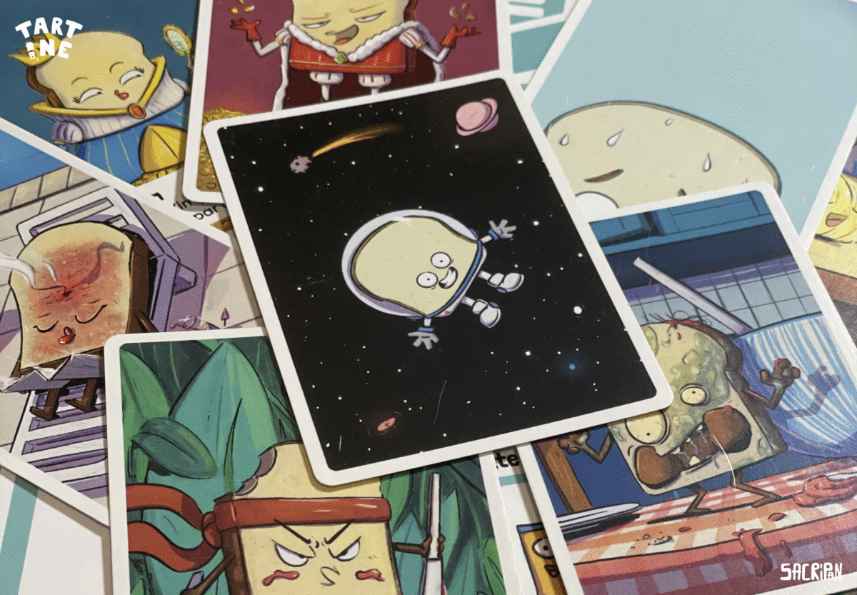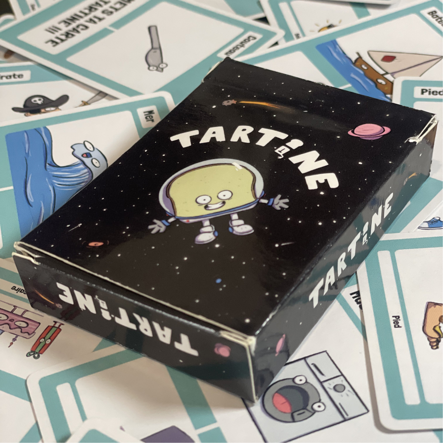 Tartine est un jeu de carte réalisé pour aider à faire une demande en mariage. Le but du jeu est de suivre le chemin en posant les cartes Mots jusqu’a être le premier à poser sa carte Tartine. Une carte beurre spéciale a été créer afin de mettre du beurre sur la tartine à la fin de la partie, et ainsi faire sa demande en mariage. J’ai également réaliser un pack de stickers qui est disponible dans le shop.